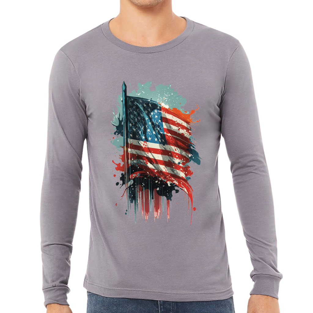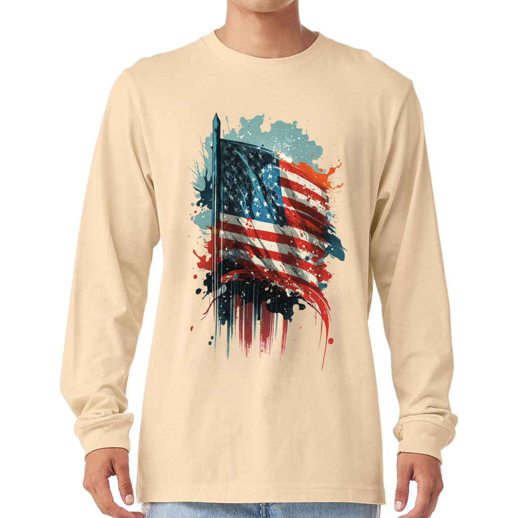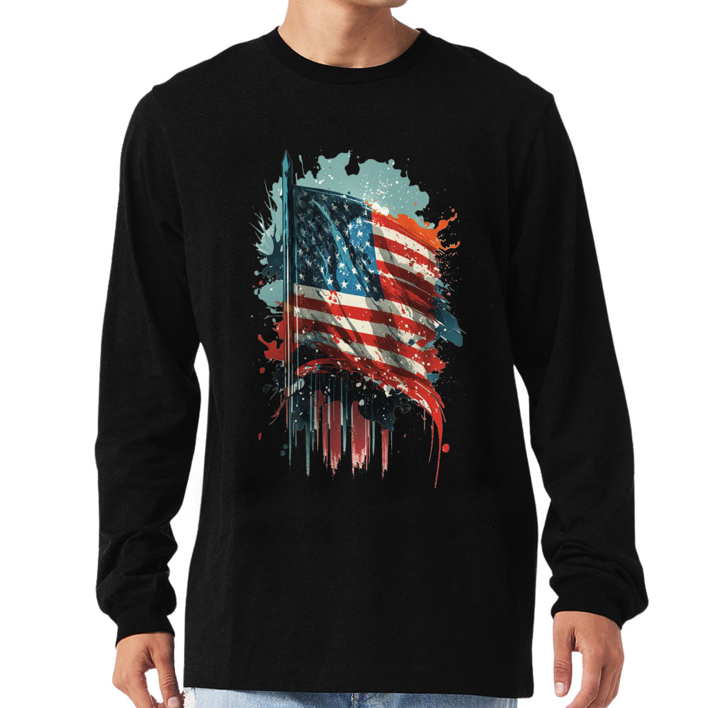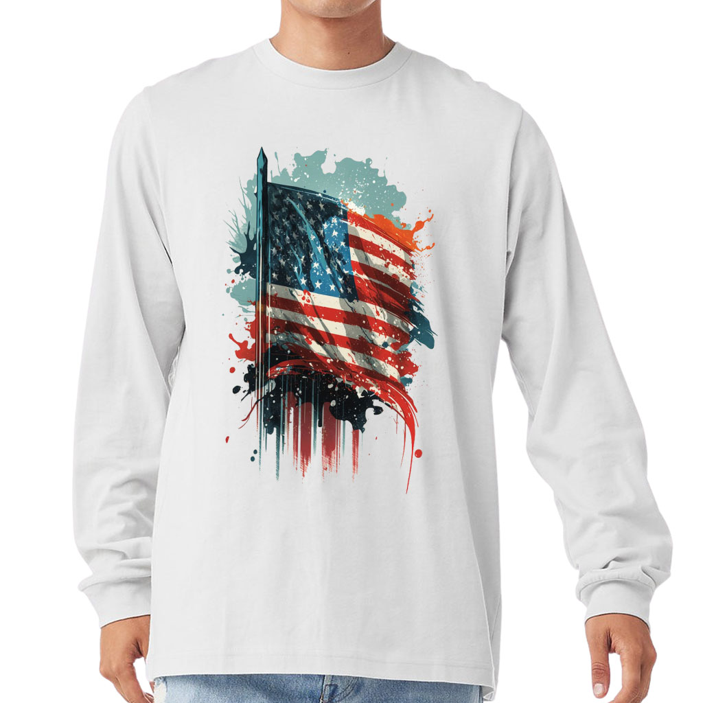 American Flag Printed Long Sleeve T-Shirt – Paint T-Shirt – Patriotic Long Sleeve Tee