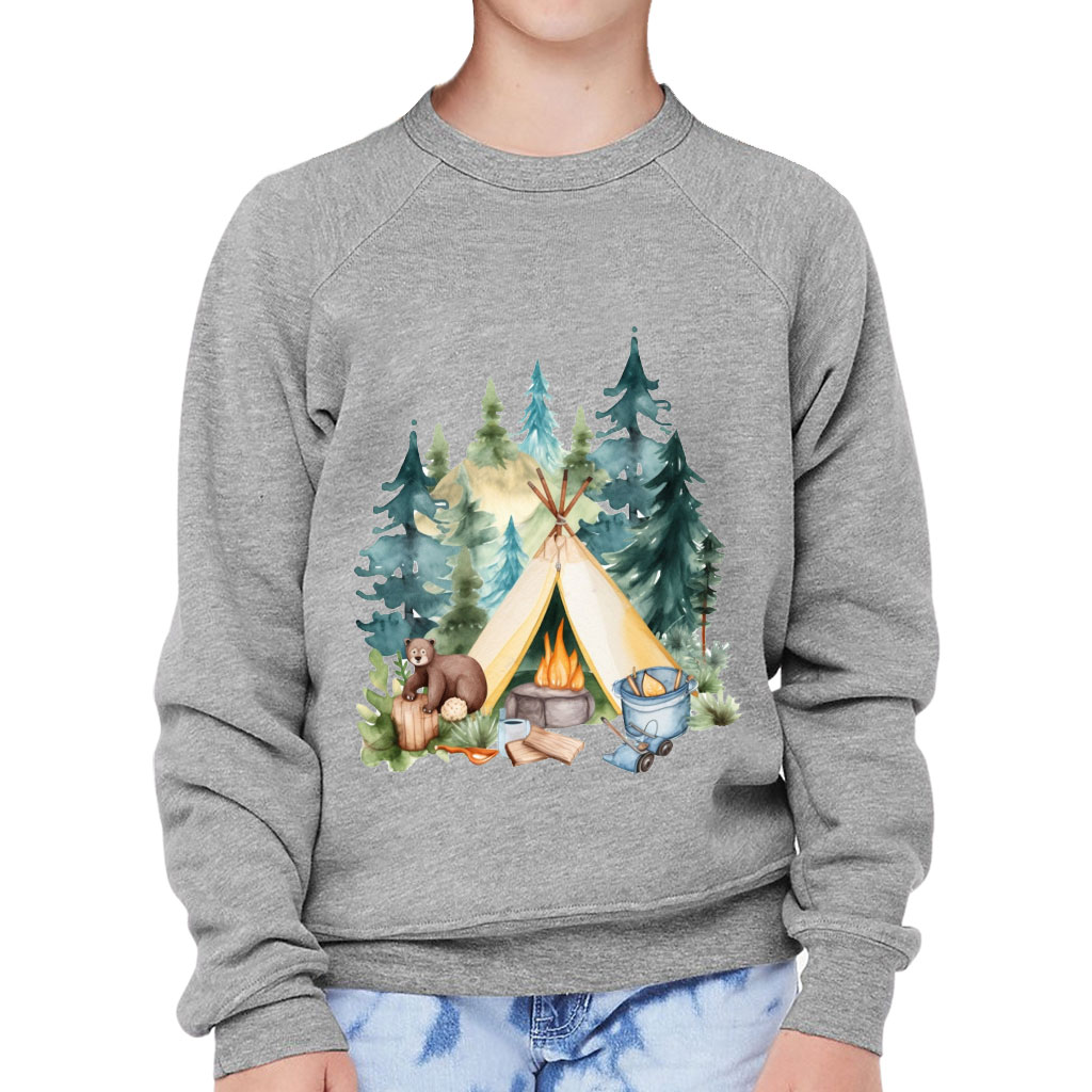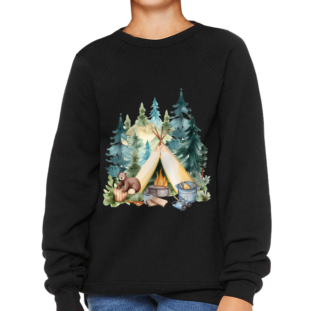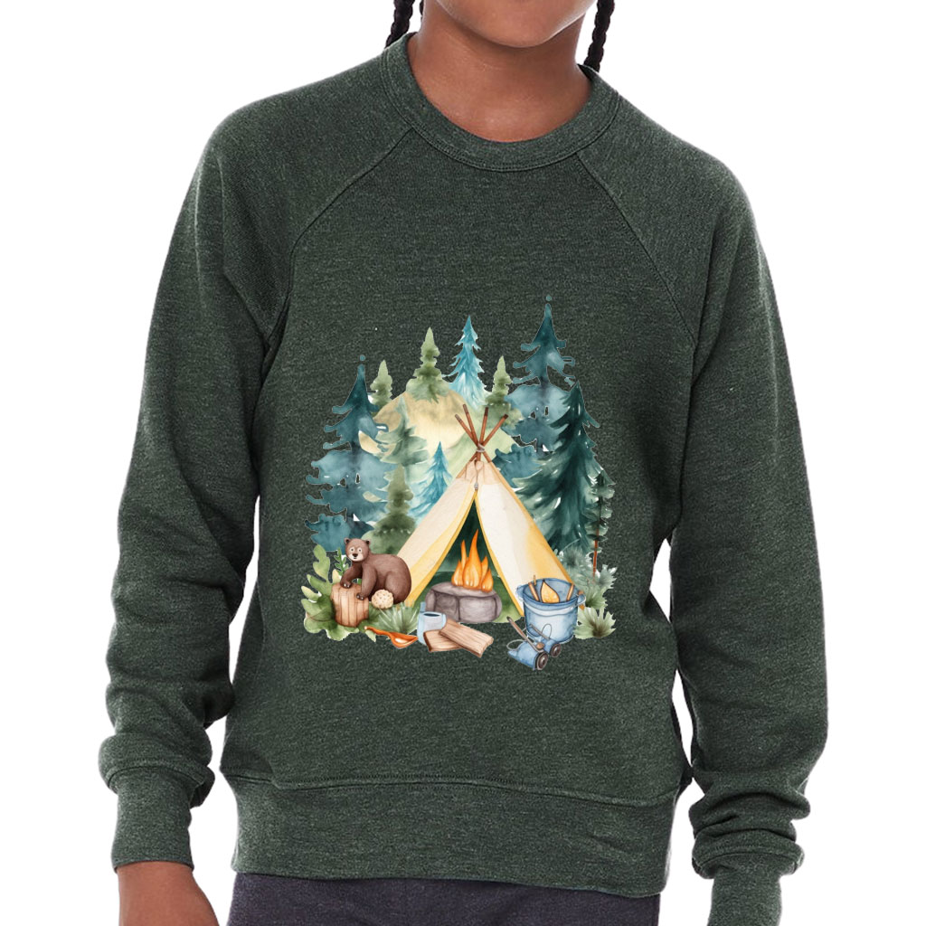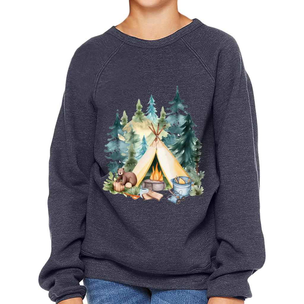 Camping Scene Kids’ Raglan Sweatshirt – Cute Art Sponge Fleece Sweatshirt – Illustration Sweatshirt