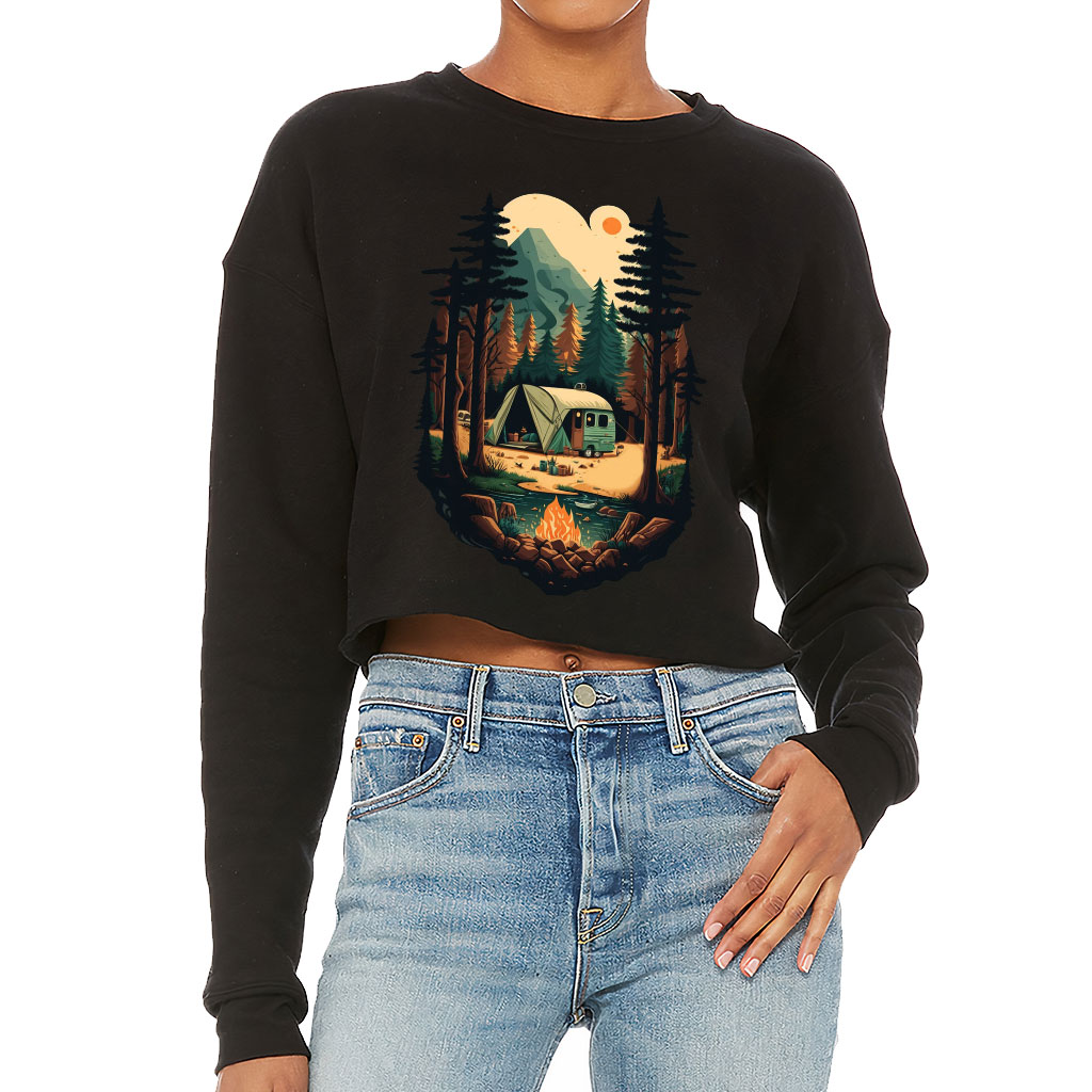 A classic women’s cropped sweater in comfy, super-soft fleece designed for warmth and breathability. Camping Themed Cropped Sweatshirt features an on-trend drop-shoulder seam and a retail fit. Finished with ribbed cuffs and a raw hem finish. Offered in poly-cotton sponge fleece.