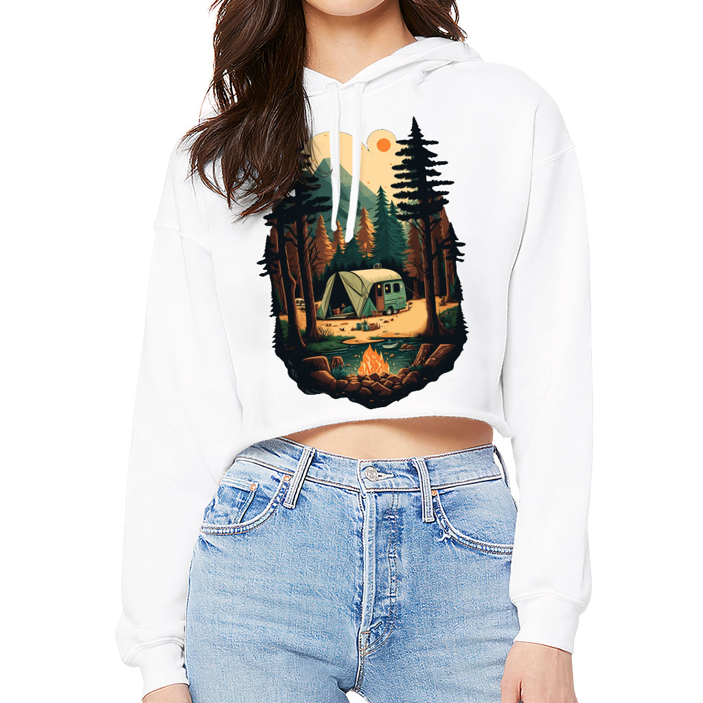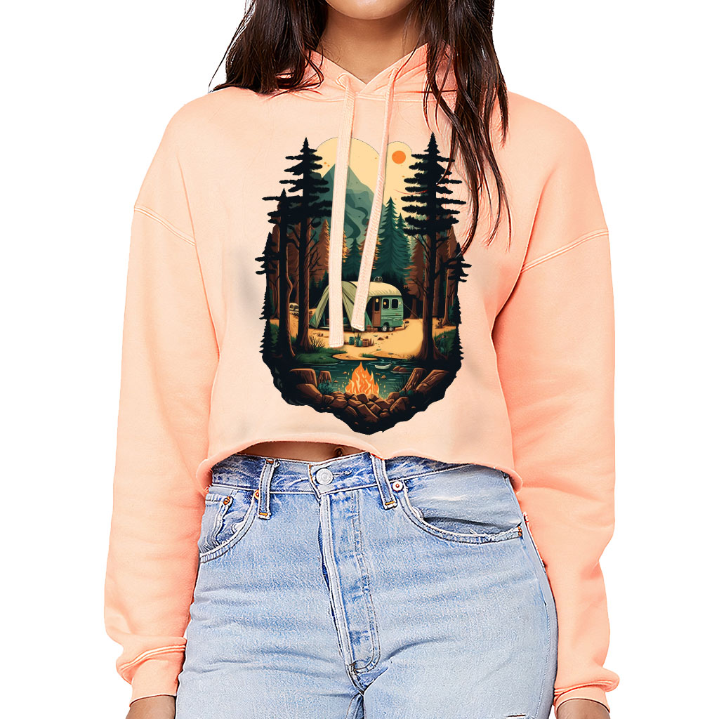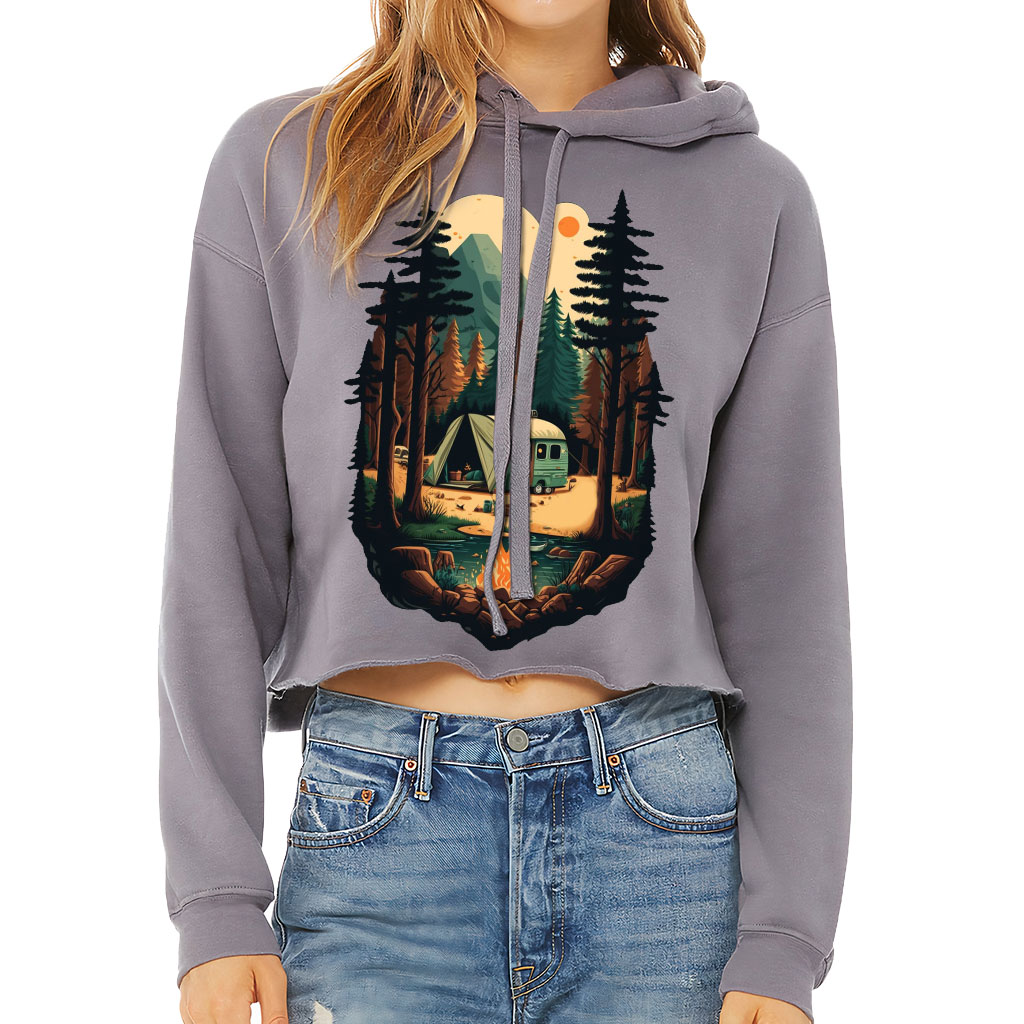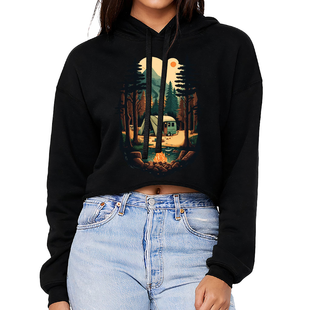 Camping Themed Women’s Cropped Hoodie – Forest Cropped Hoodie – Cool Hooded Sweatshirt