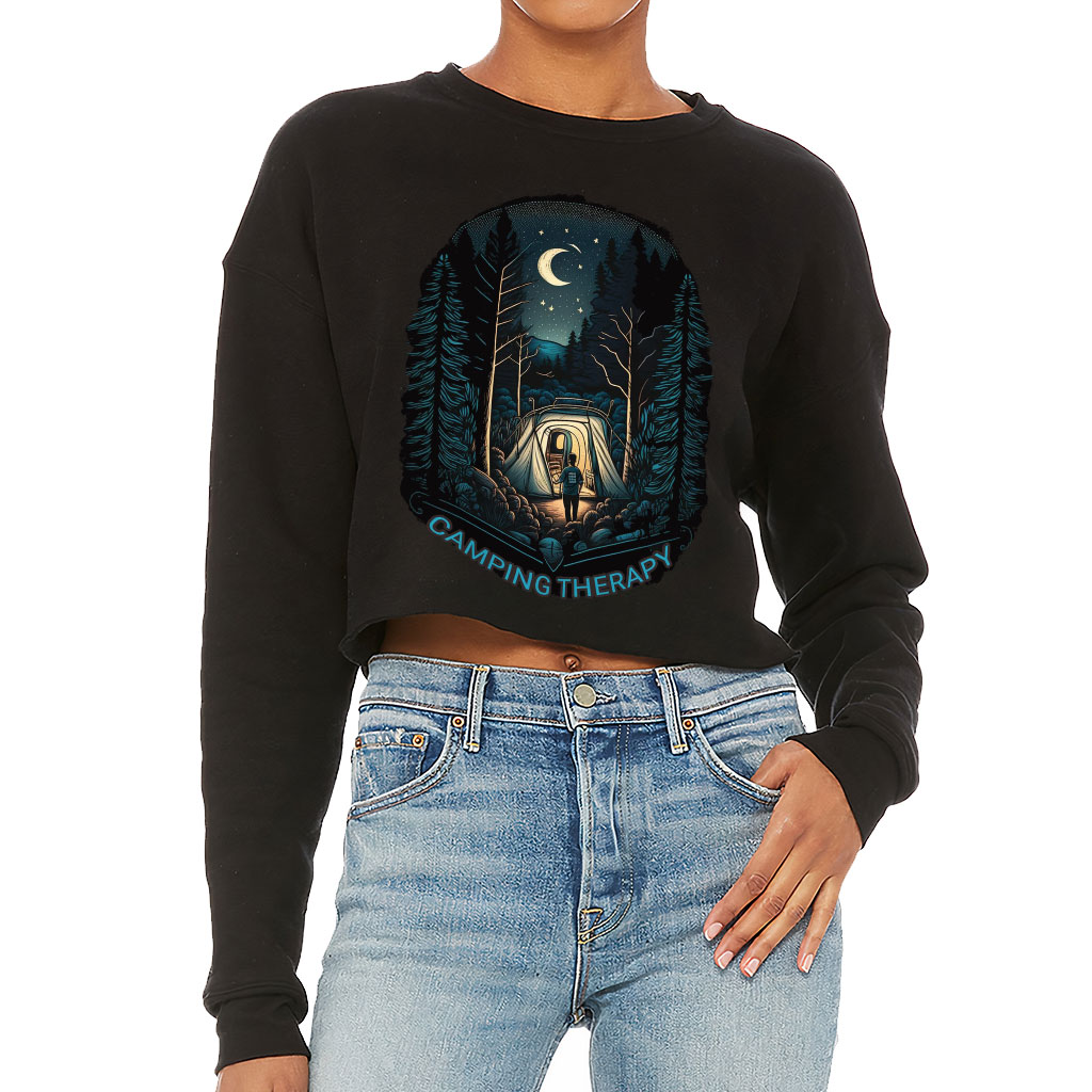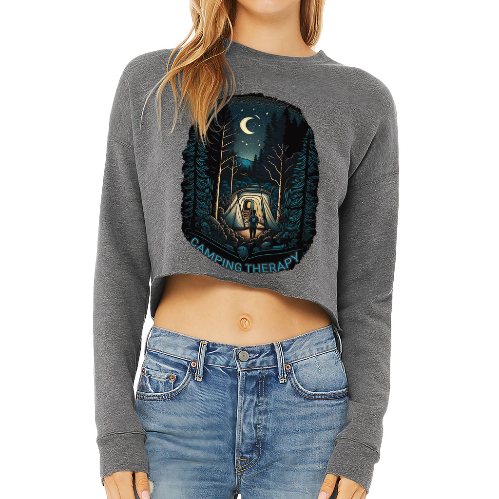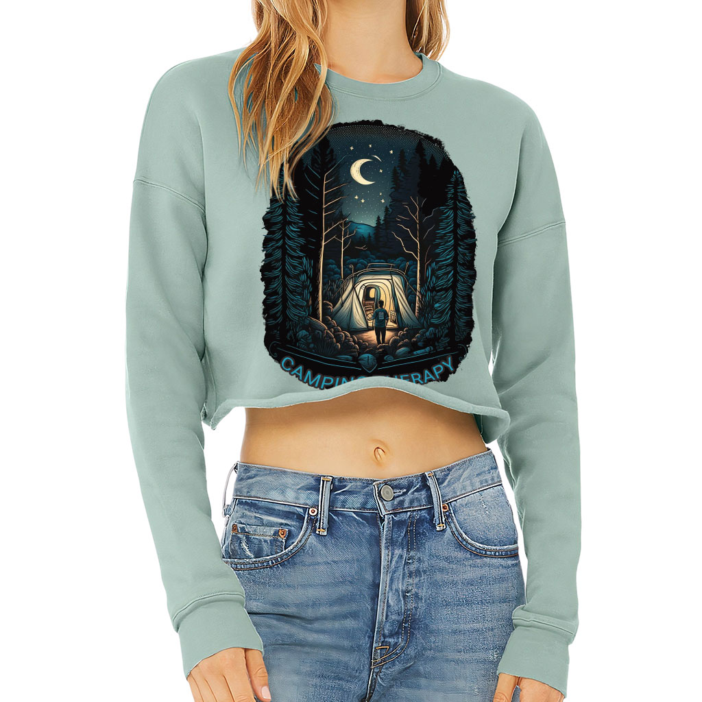 Camping Therapy Cropped Sweatshirt – Cool Women’s Sweatshirt – Unique Design Crop Crew Sweatshirt