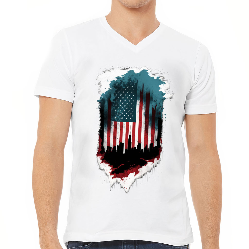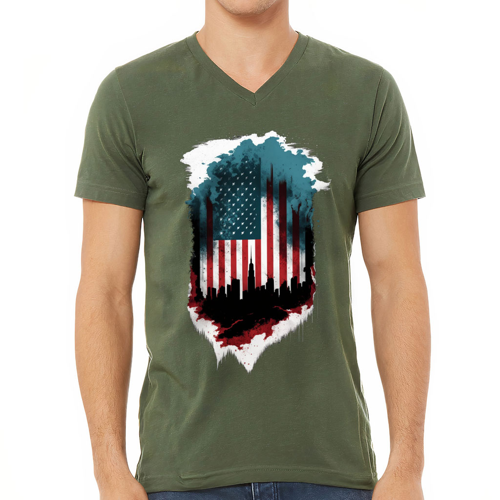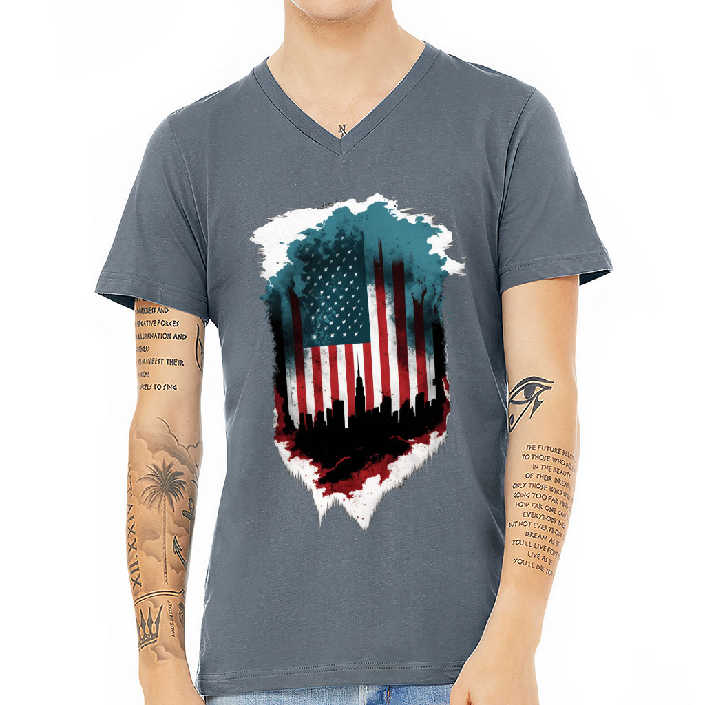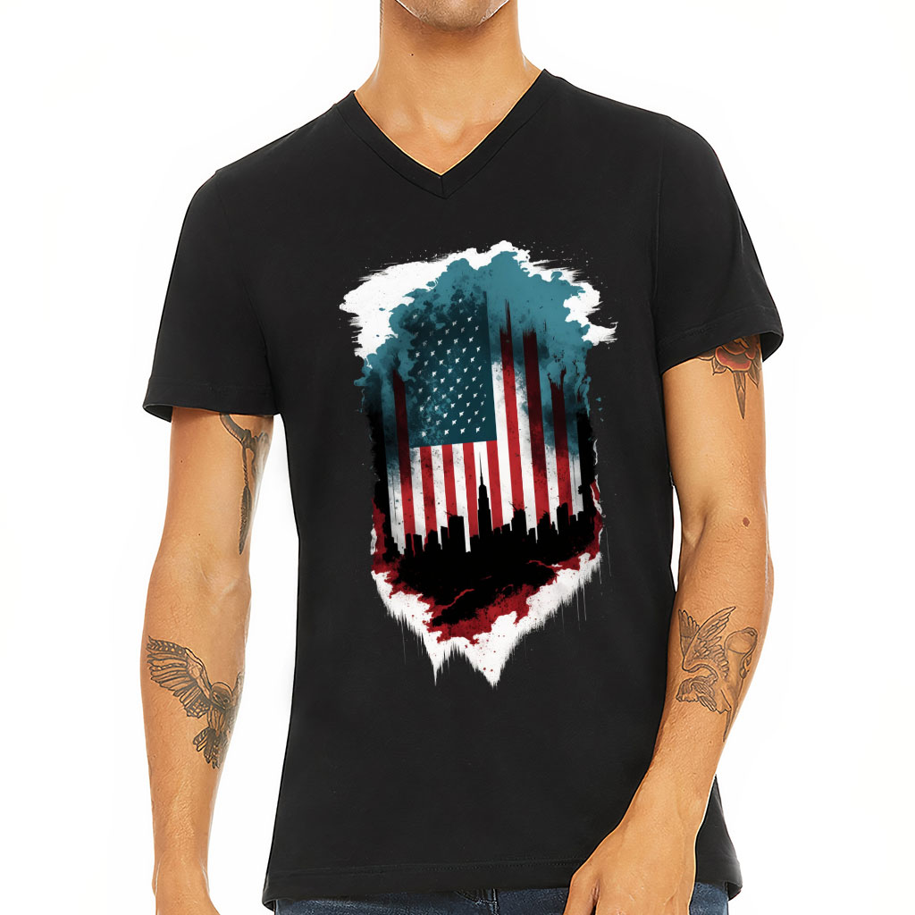 City Skyline Silhouette V-Neck T-Shirt – USA Flag T-Shirt – Cool V-Neck Tee