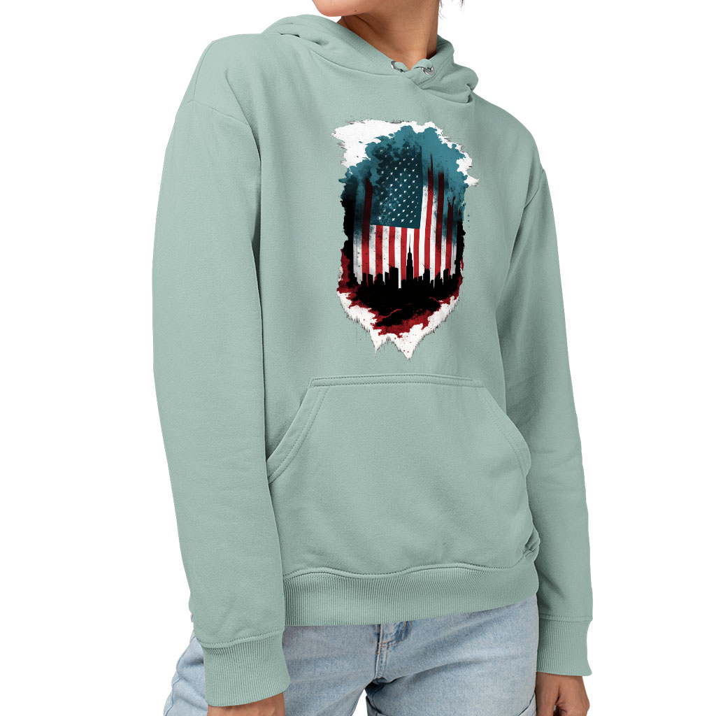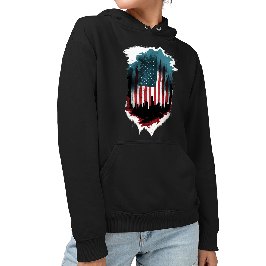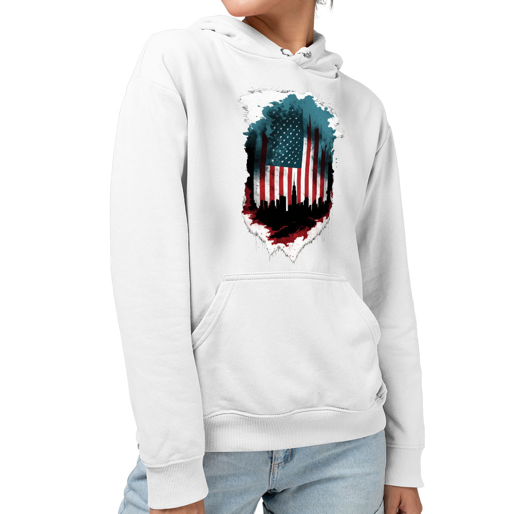 Cool USA Flag Sponge Fleece Hoodie – Unique Hoodie – Cityscape Hooded Sweatshirt