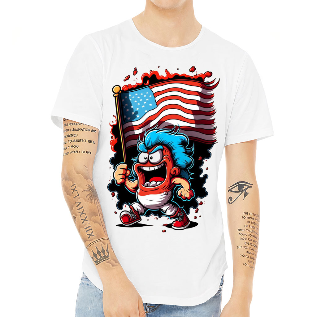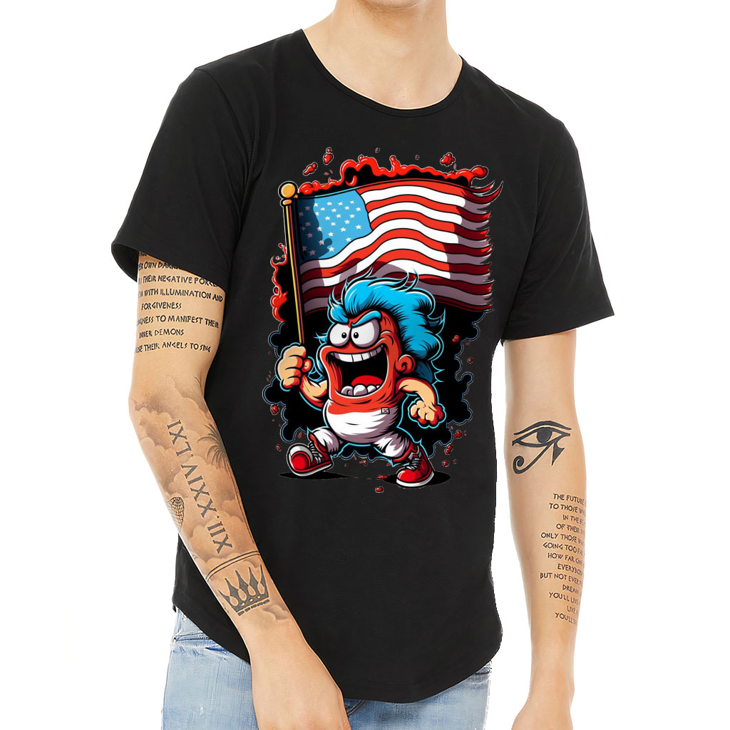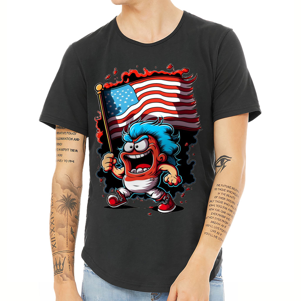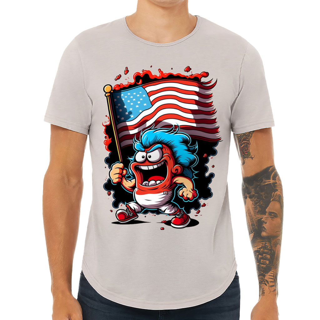 Funny USA Flag Curved Hem T-Shirt – Cartoon T-Shirt – Funny Curved Hem Tee