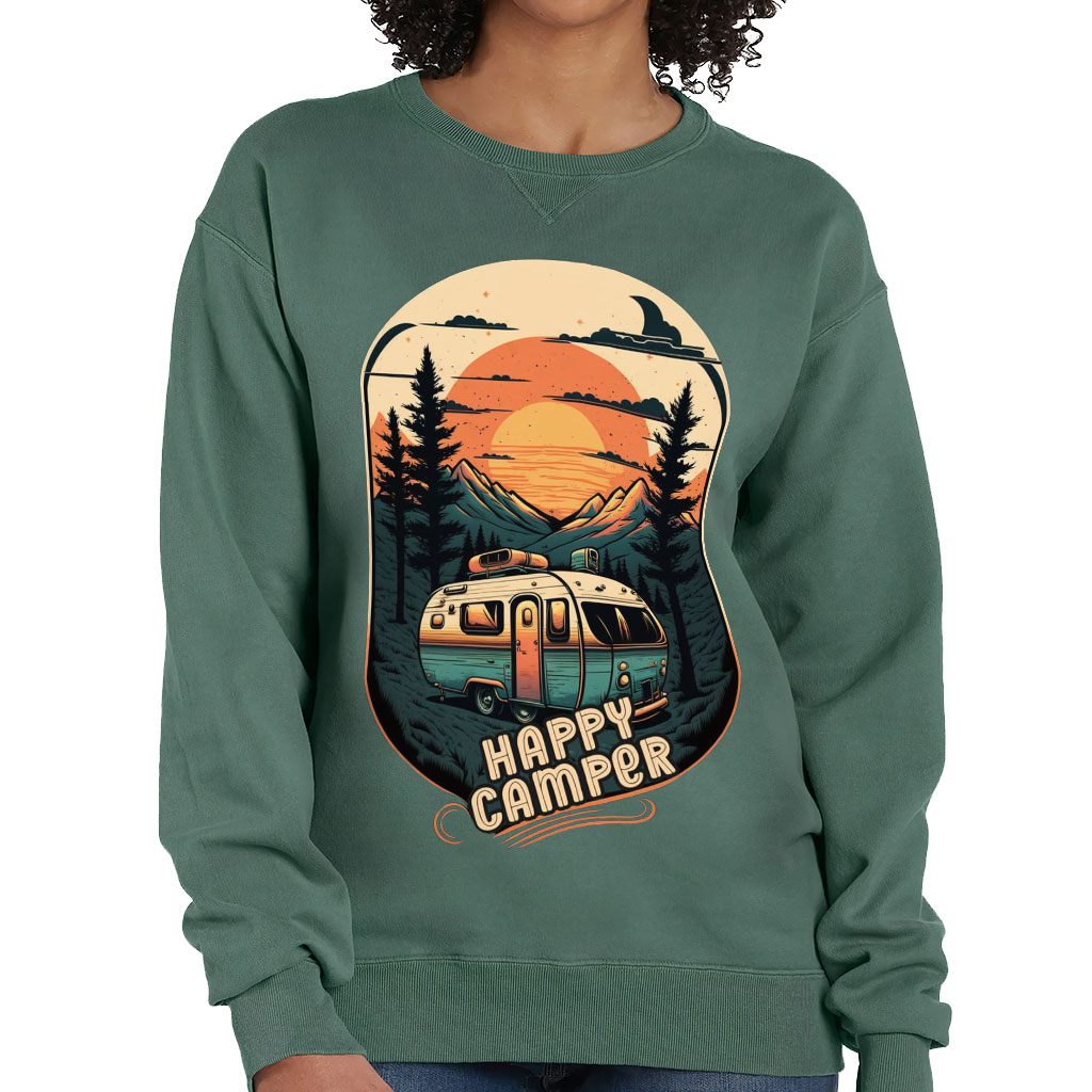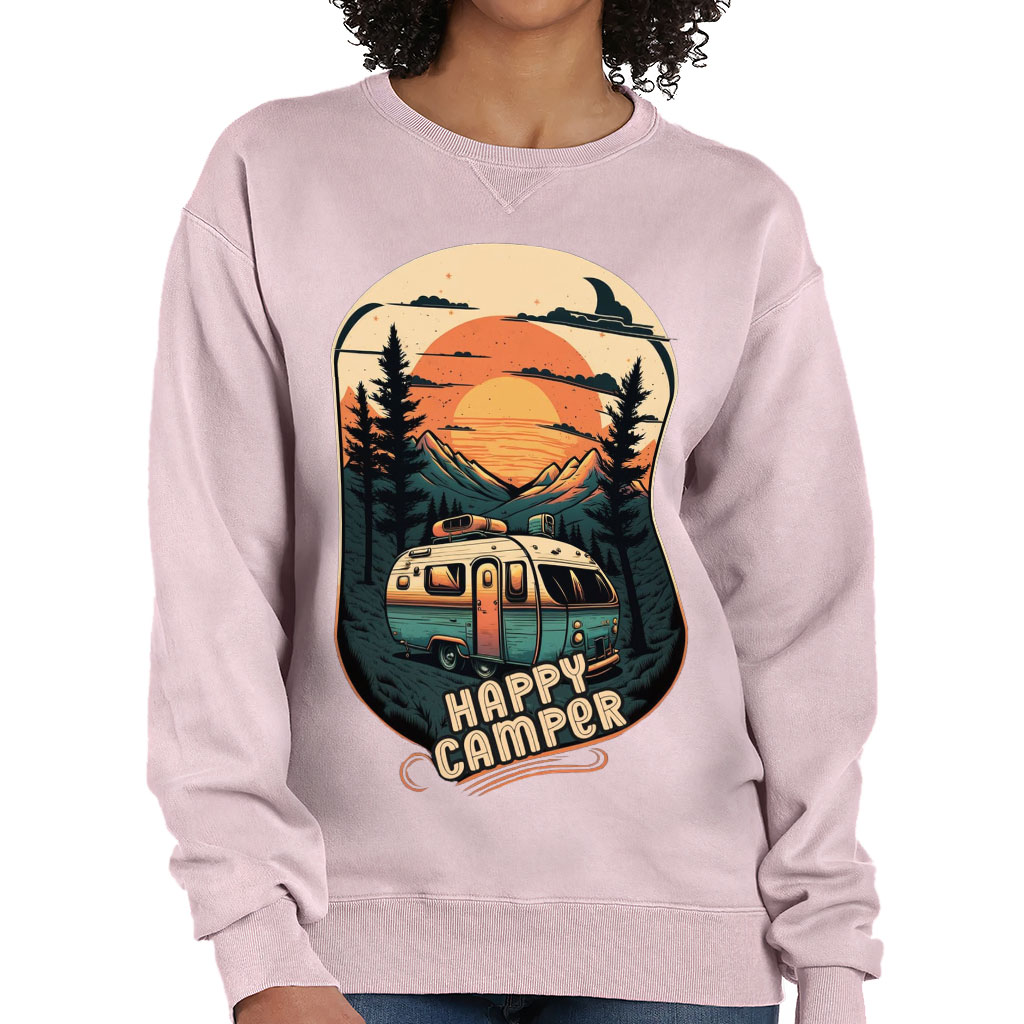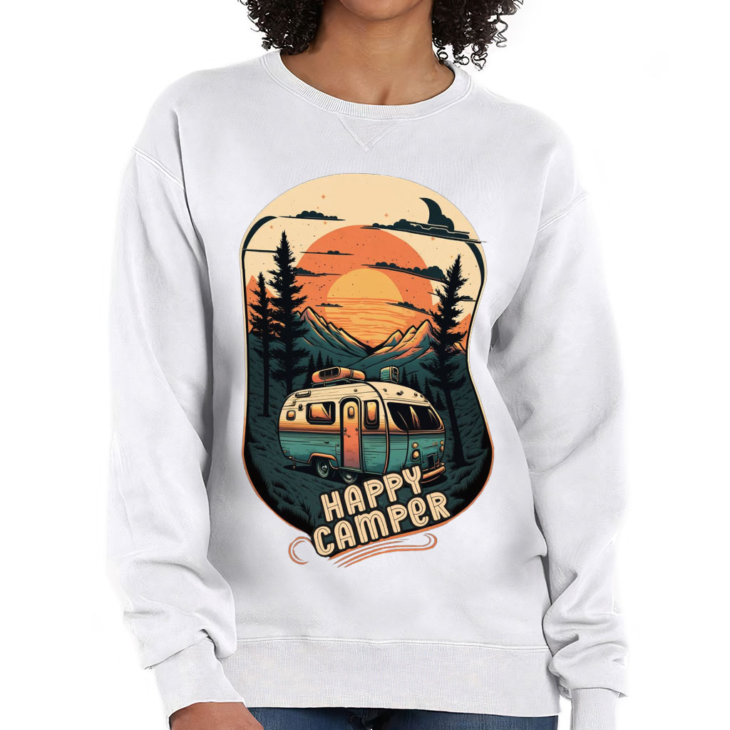 Happy Camper Crewneck Sweatshirt – Sunset Women’s Sweatshirt – Graphic Art Sweatshirt