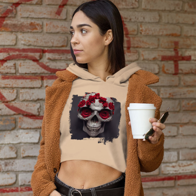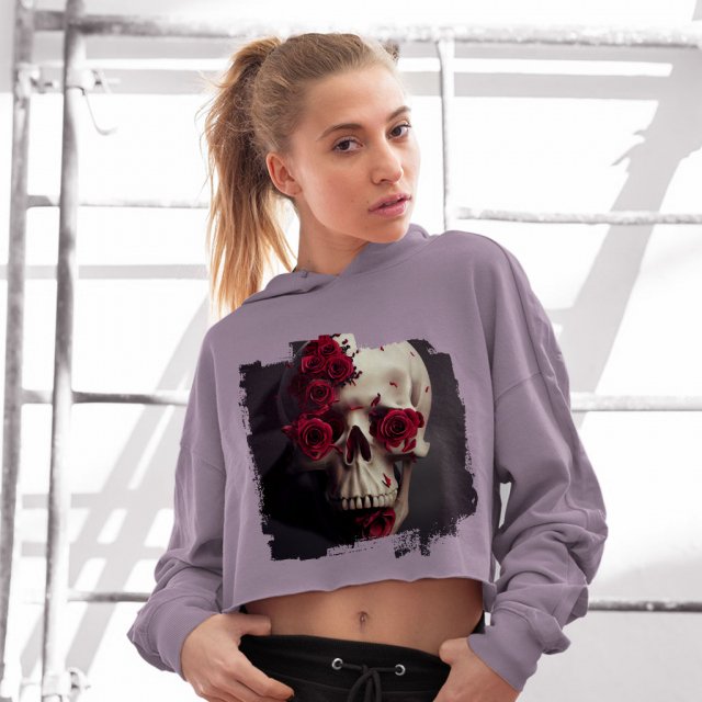 Skull With Roses Women’s Cropped Hoodie – Flower Cropped Hoodie – Art Hooded Sweatshirt