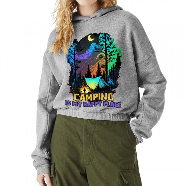 Camping Is My Happy Place Cinched Bottom Hoodie – Nature Women’s Hoodie – Graphic Hooded Sweatshirt
