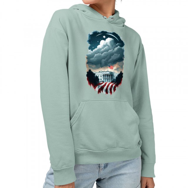 USA Flag Design Cinched Bottom Hoodie – Cityscape Women’s Hoodie – Patriotic Hooded Sweatshirt