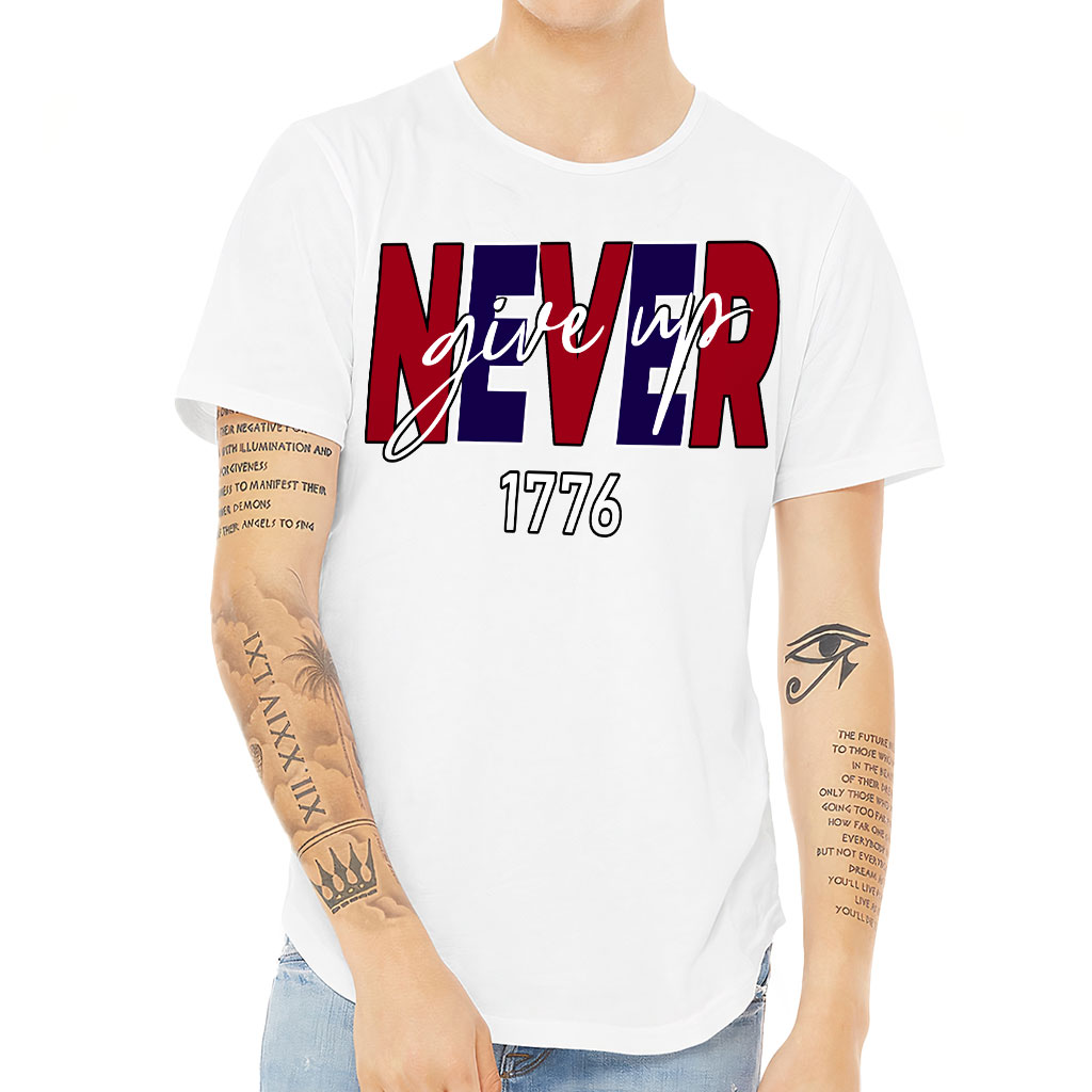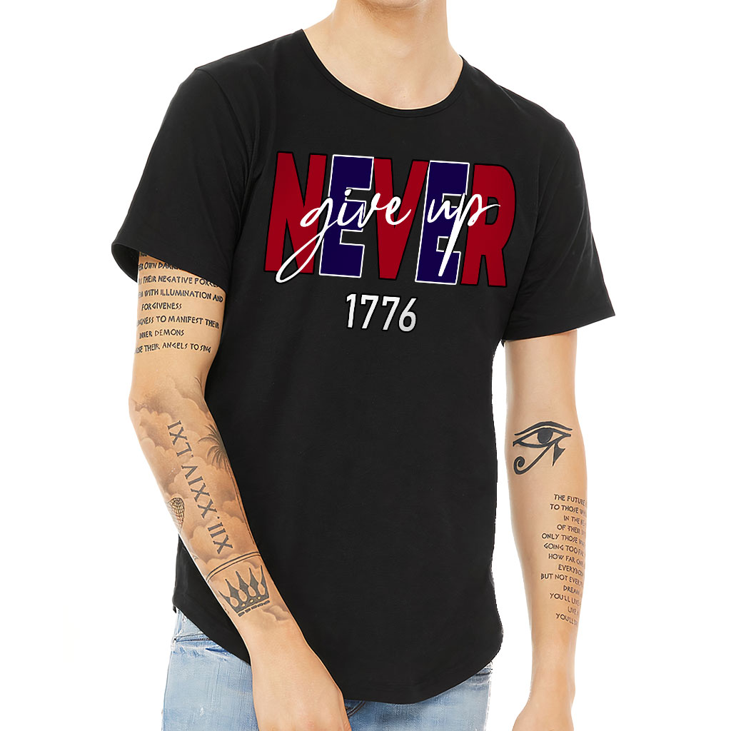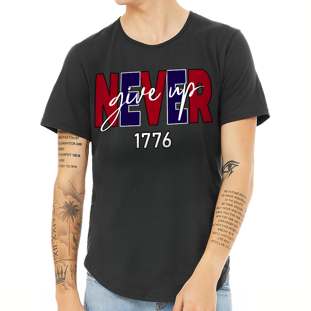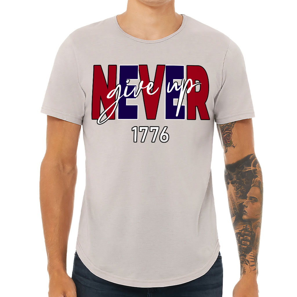 Never Give Up Curved Hem T-Shirt – USA T-Shirt – America Curved Hem Tee