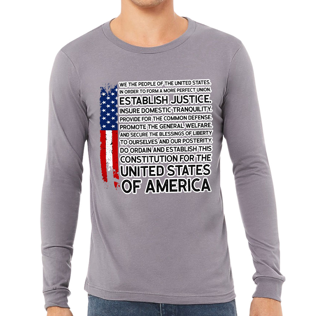 Patriotic Design Long Sleeve T-Shirt is proudly made with 7x less water than average manufacturers, in recycle-friendly facilities that also guarantee zero sweatshop conditions. Word Art T-Shirt is designed and printed in California.