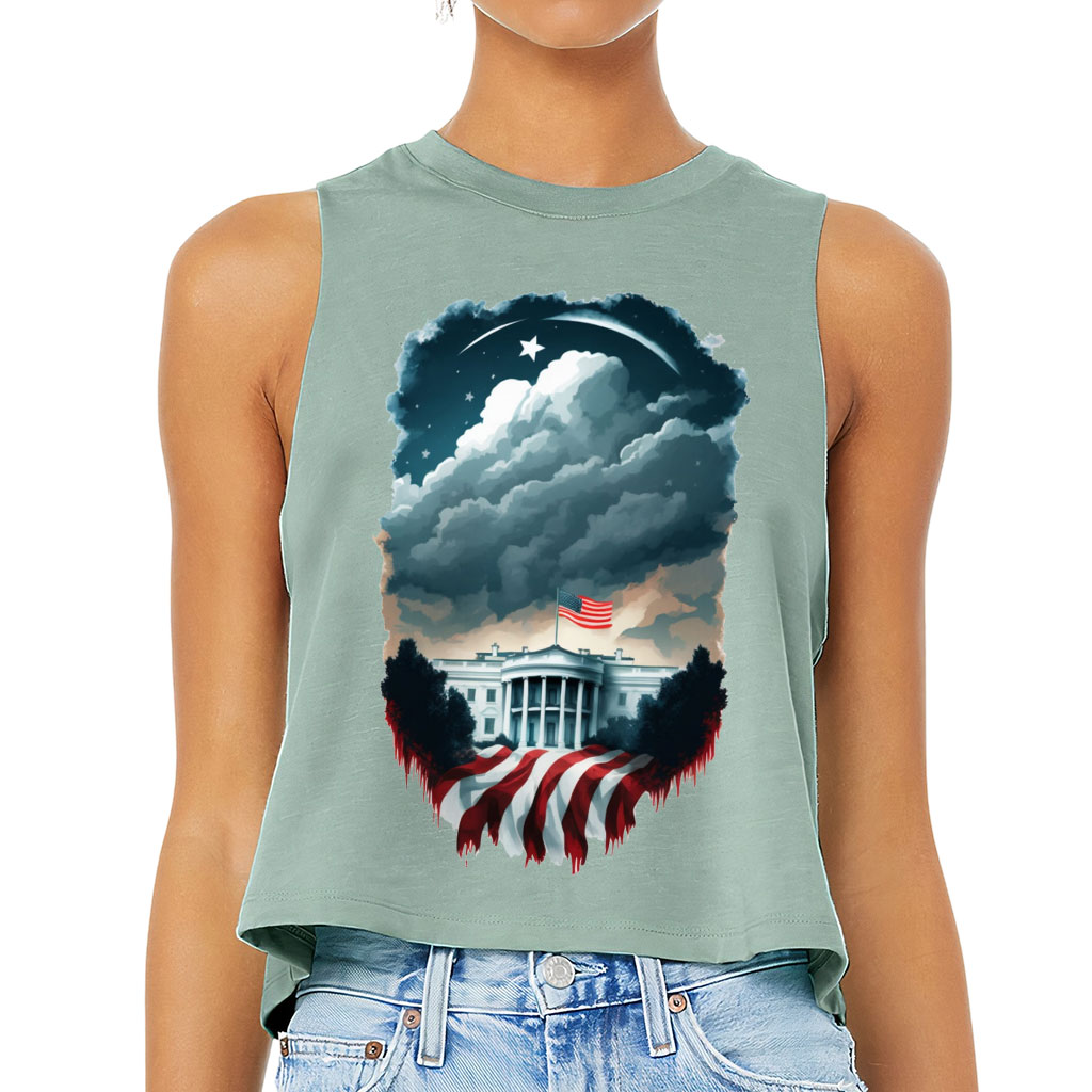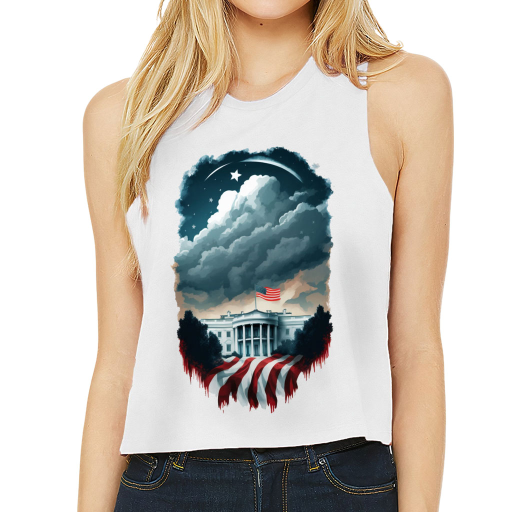 Patriotic Racerback Cropped Tank Show off your style with Cool Gifts! This cool and comfortable top is just what your wardrobe needs. Featuring a side-seamed relaxed fit that falls softly from the shoulders to a cropped finish, it’s perfect for flaunting your figure. Brass-colored raw edge arm holes and a racerback…