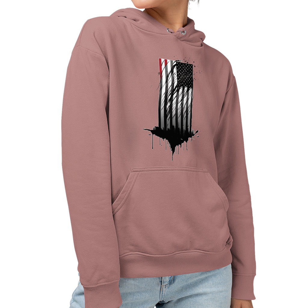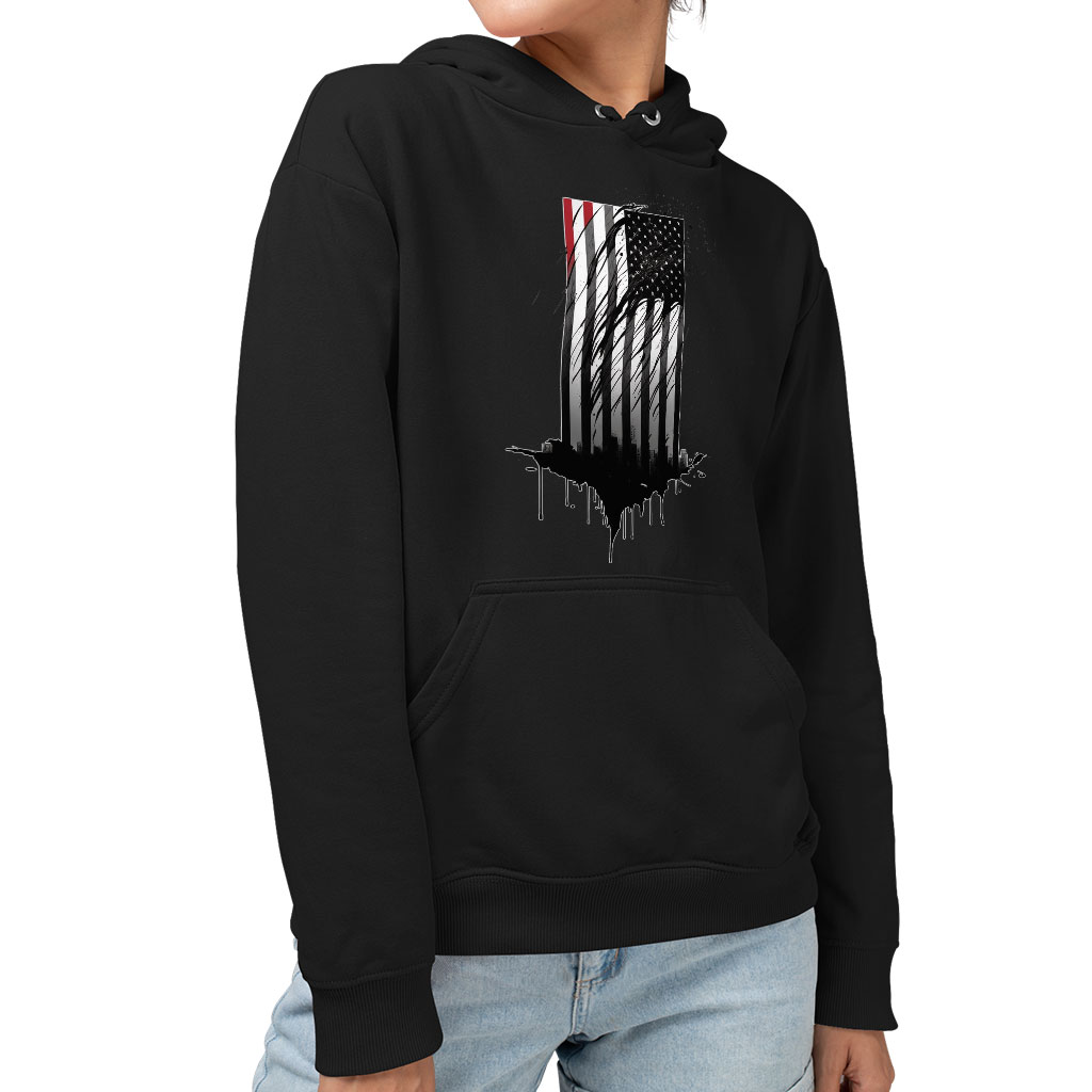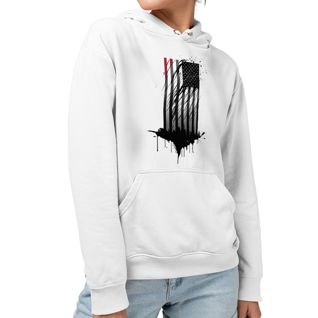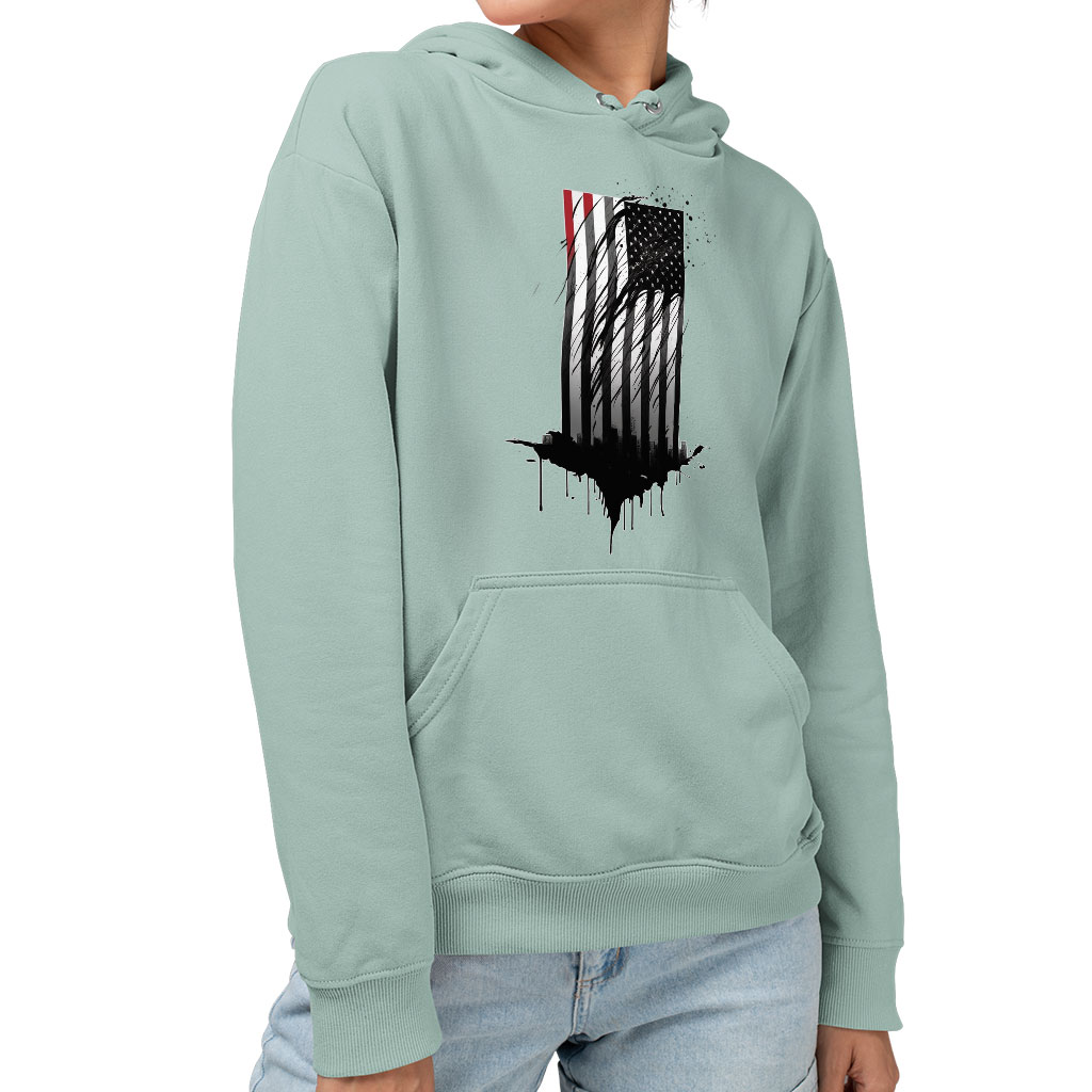 USA Flag Design Sponge Fleece Hoodie – Cityscape Hoodie – Patriotic Hooded Sweatshirt
