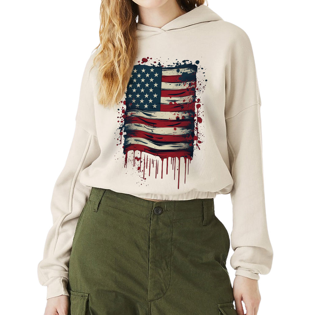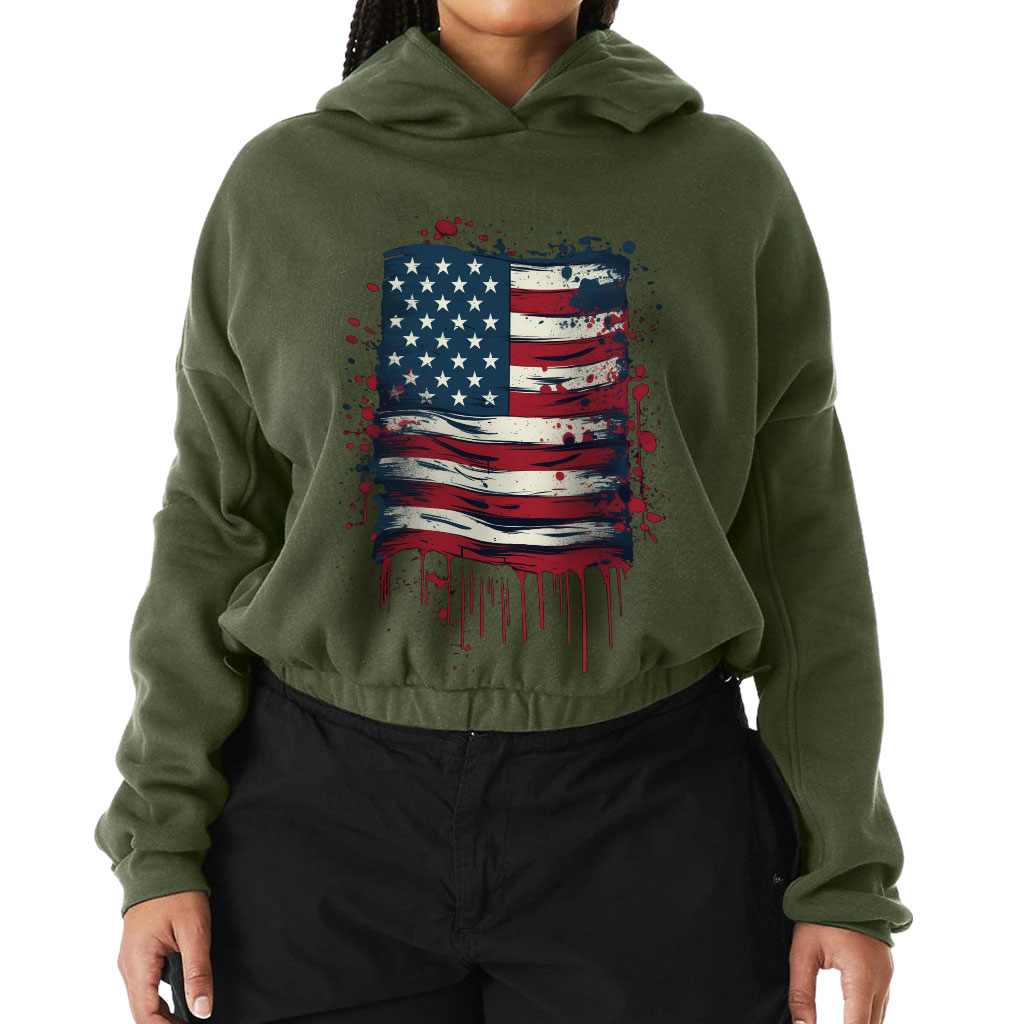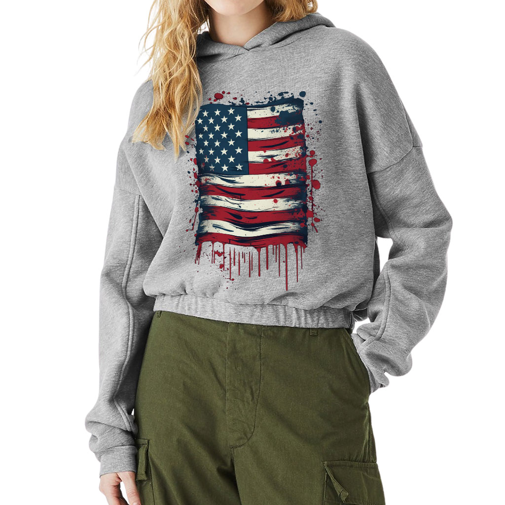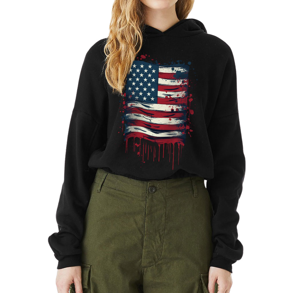USA Flag Print Cinched Bottom Hoodie – Patriotic Women’s Hoodie – Painting Hooded Sweatshirt