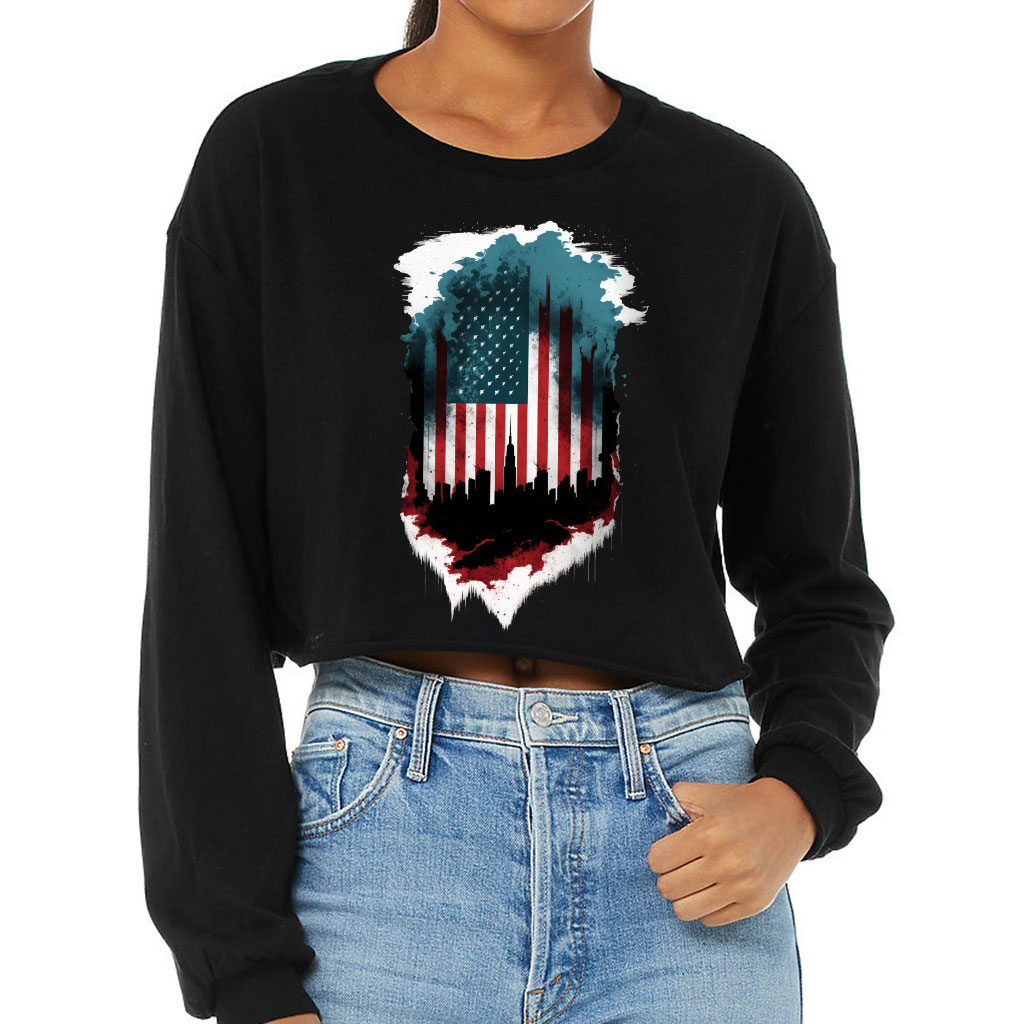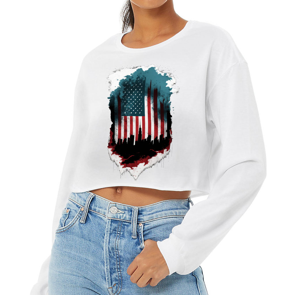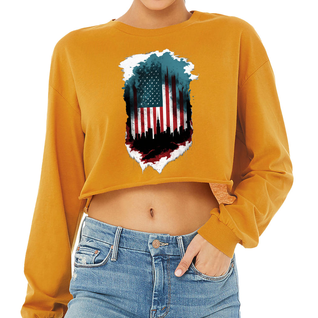 USA Flag Print Cropped Long Sleeve T-Shirt – Unique Gifts – American Themed Items