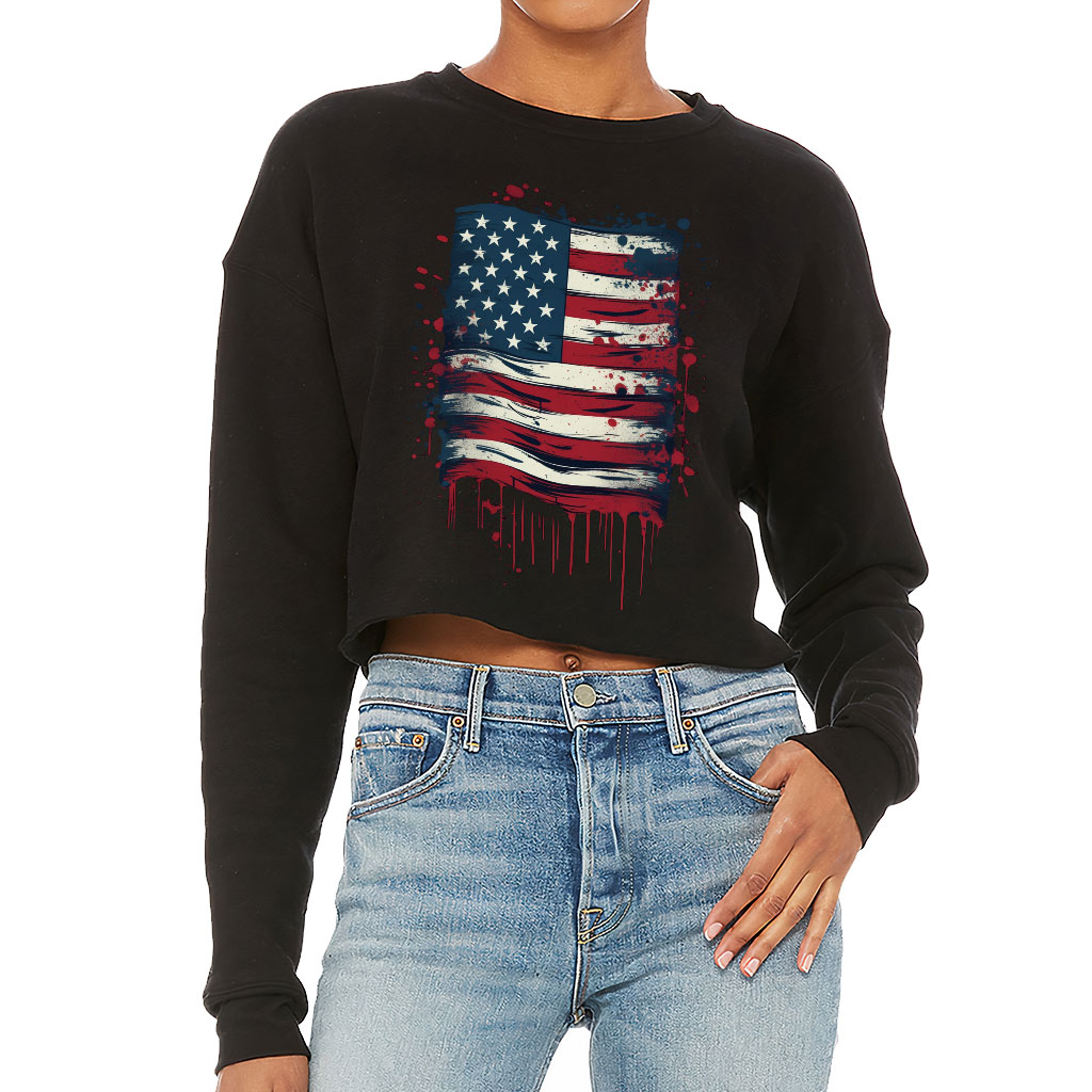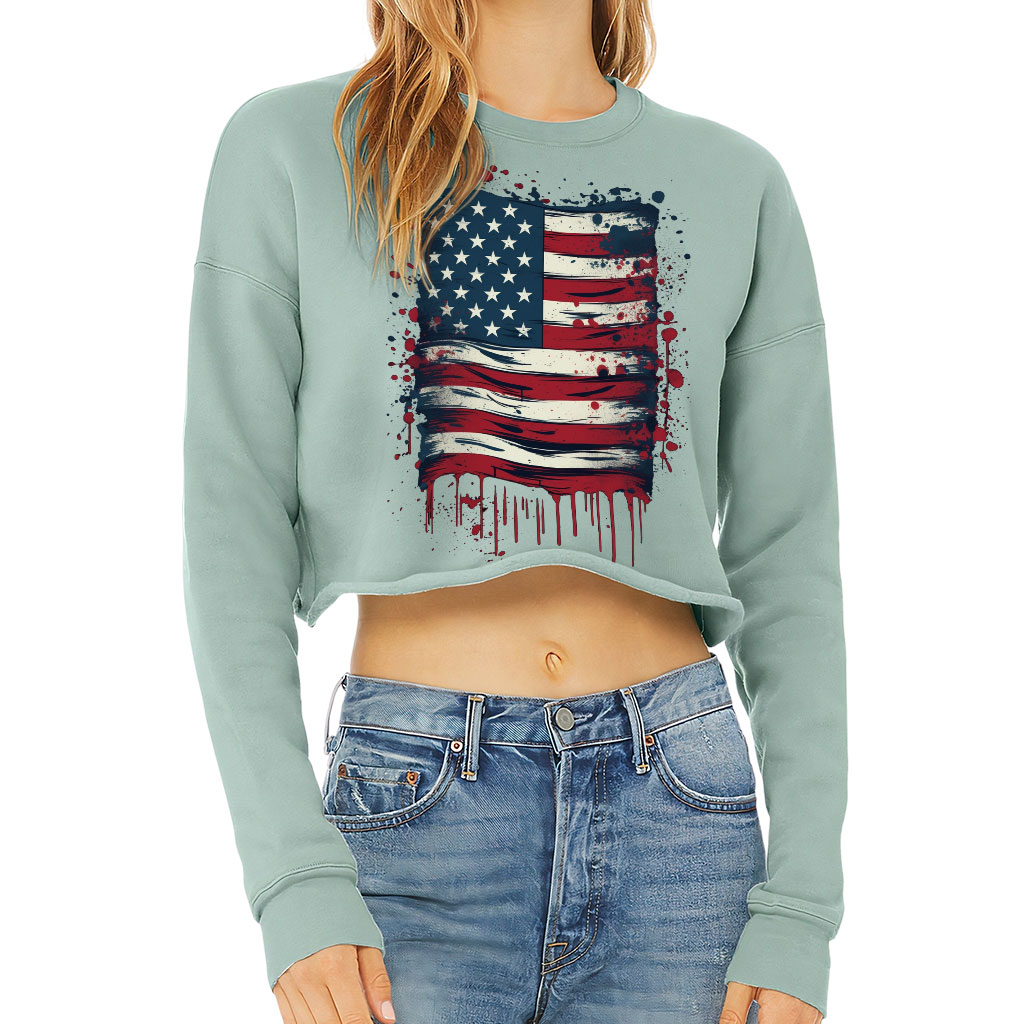 USA Flag Print Cropped Sweatshirt – Patriotic Women’s Sweatshirt – Painting Crop Crew Sweatshirt