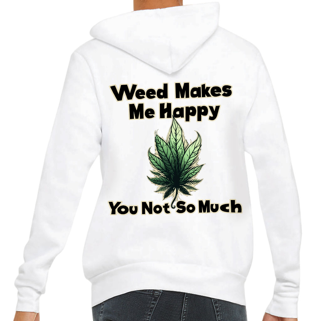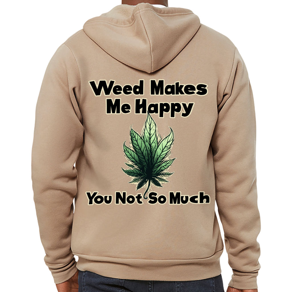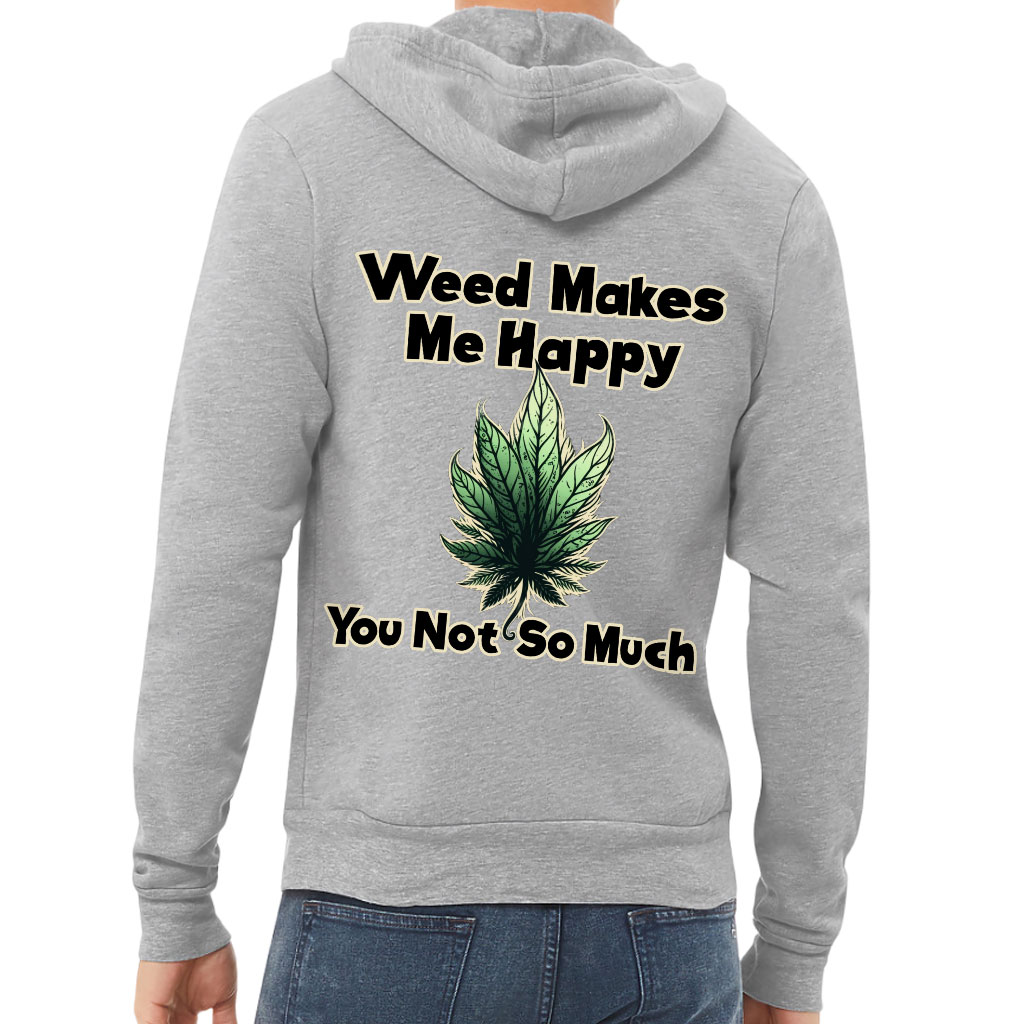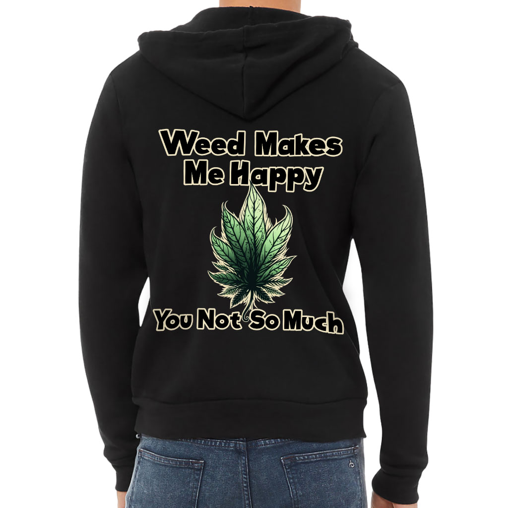 Weed Makes Me Happy Back Print Full-Zip Hoodie – Printed Hooded Sweatshirt – Leaf Hoodie