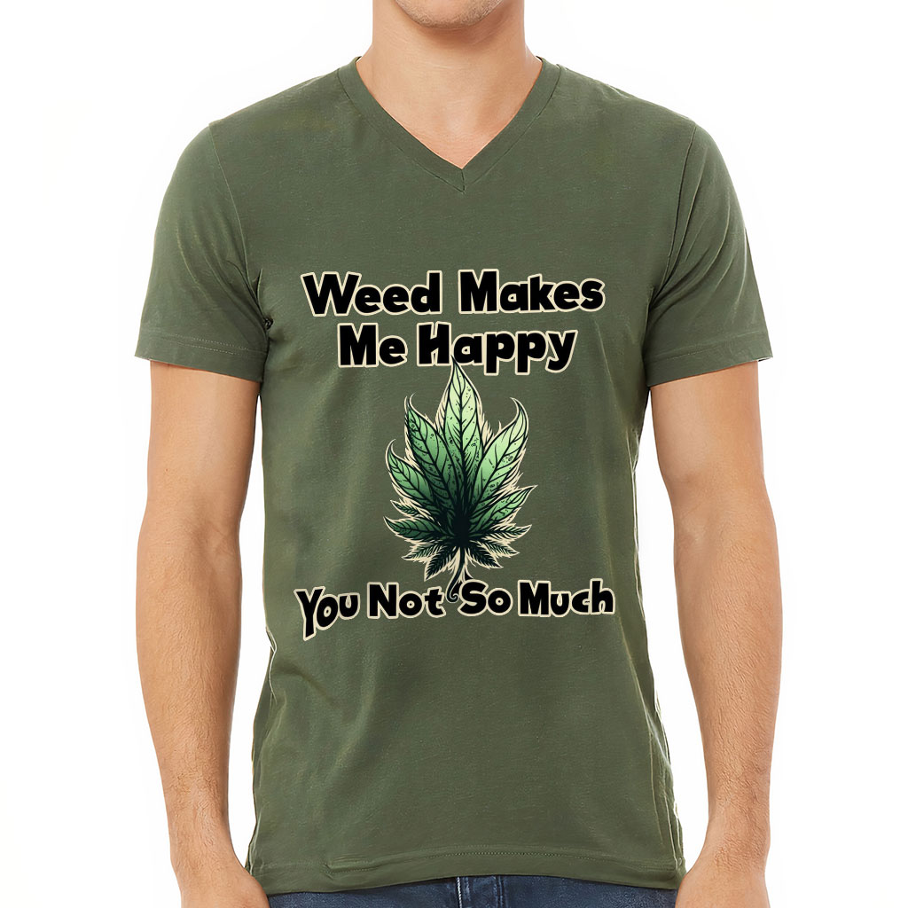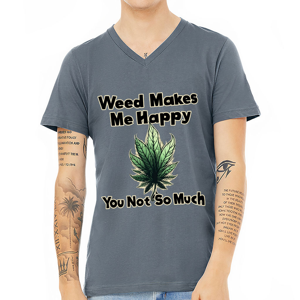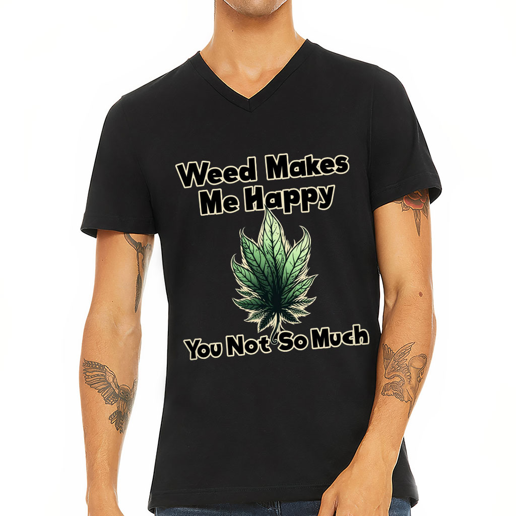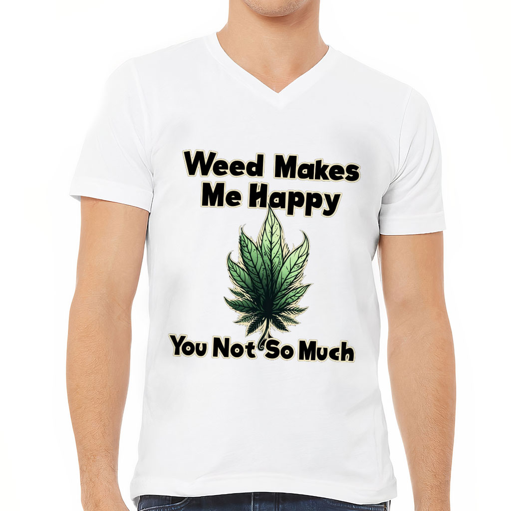 Weed Makes Me Happy V-Neck T-Shirt – Funny T-Shirt – Text Design V-Neck Tee